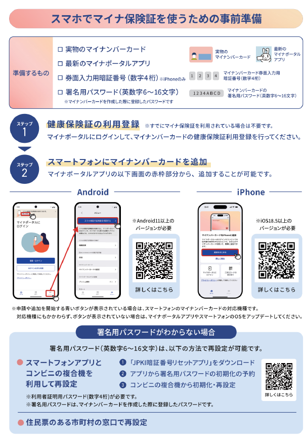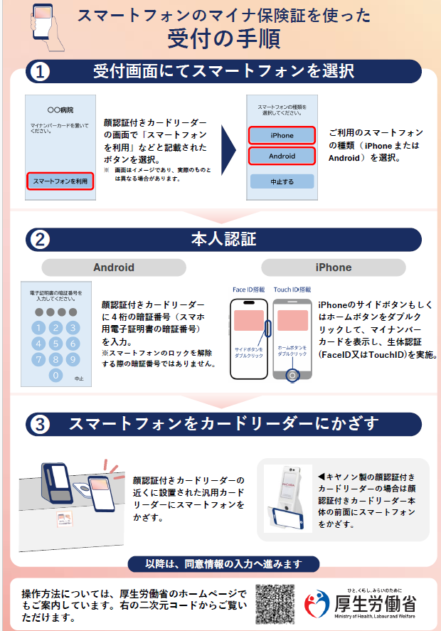 令和7年9月より、従来のマイナ保険証(マイナンバーカードの保険証)に加えて、「マイナンバーカードを搭載したスマートフォン」も保険証として利用できる仕組みが整備されました。当院でもスマートフォンでのマイナ保険証のご利用も可能となりました。ご利用の前に、ご自身での登録・設定が必要です。