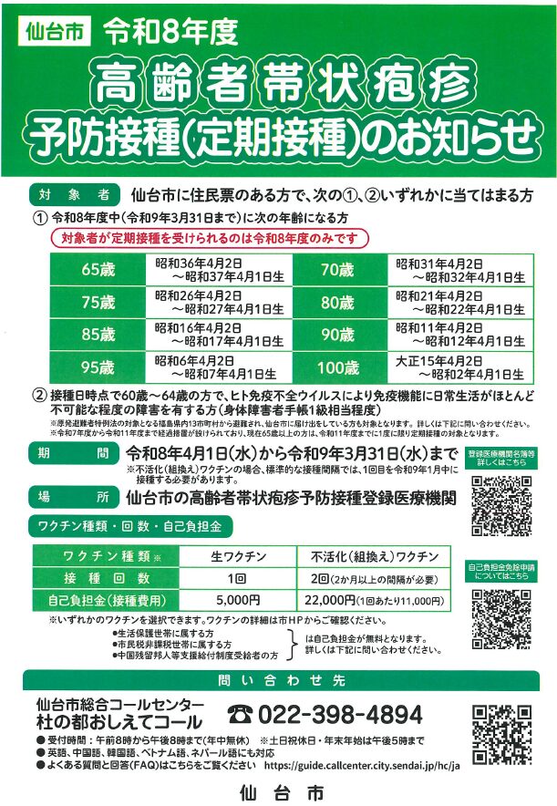 【仙台市令和8年度高齢者帯状疱疹予防接種(定期接種)のお知らせ】