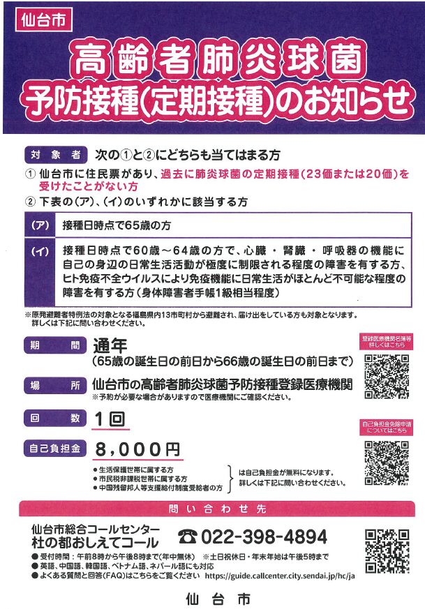 【仙台市高齢者肺炎球菌予防接種(定期接種)のお知らせ】